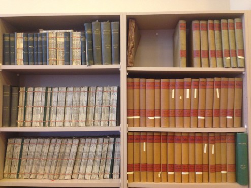 A photograph of book shelves with three rows of books. Most books have brown spines.