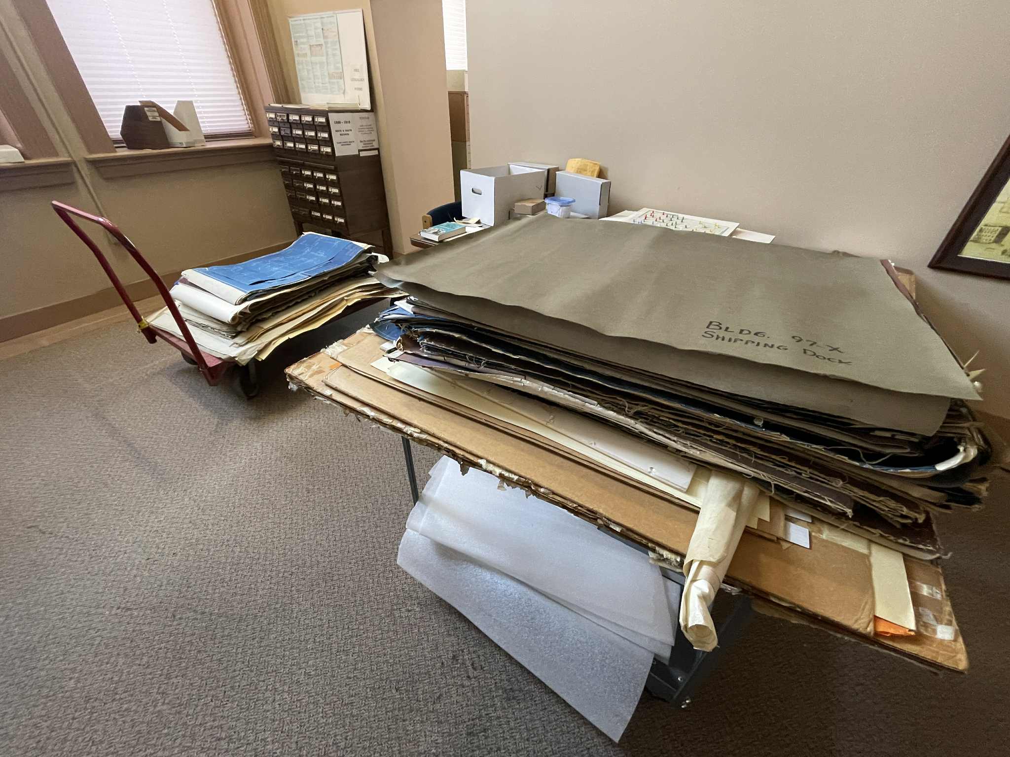 A photograph of a table with large folders and blueprints on top. Another cart with blueprints is in the background.