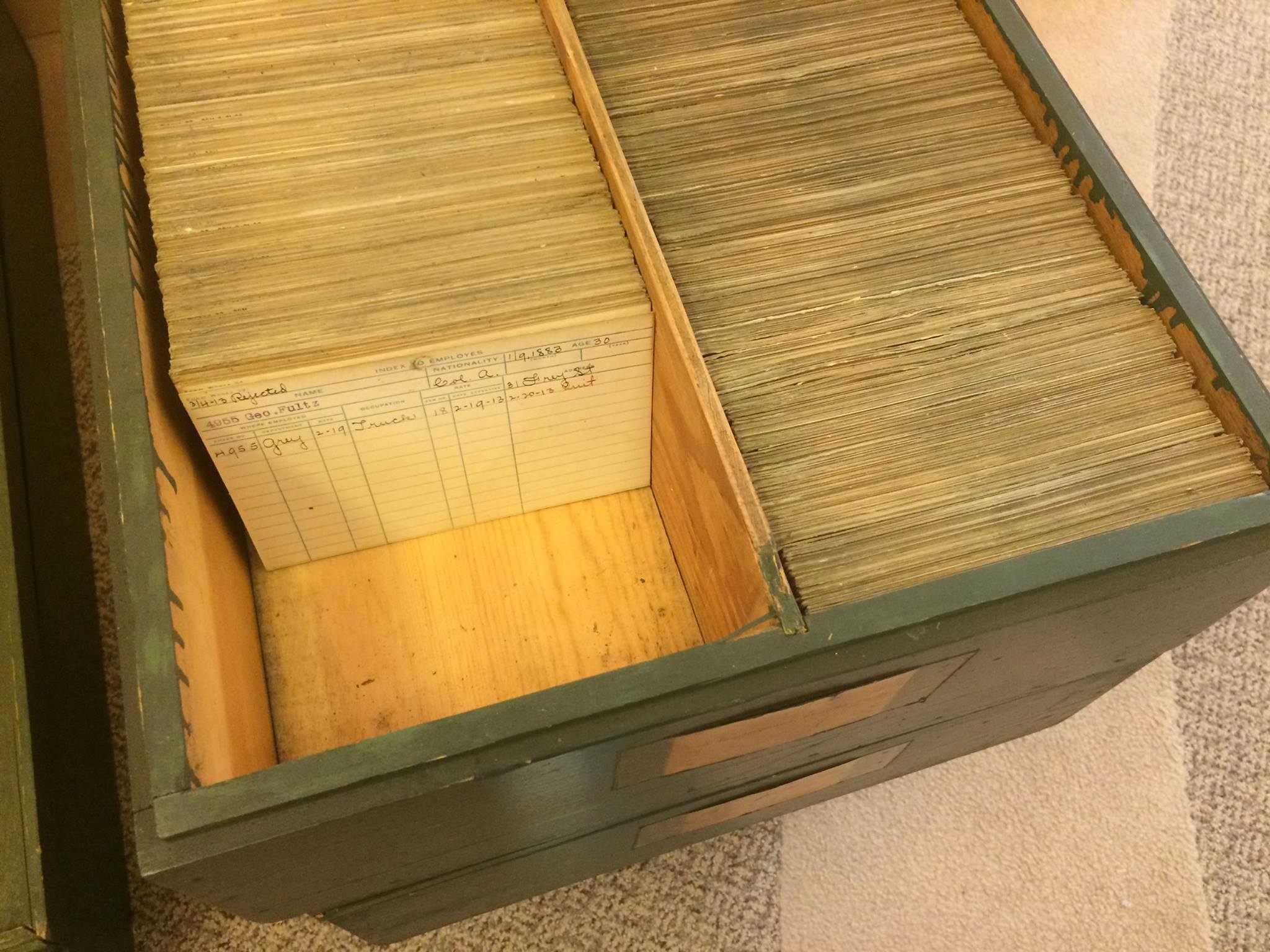 We also preserve a large general collection on International Harvester and early employee records. When they were donated, they came to us in four massive green wooden boxes filled with employee record cards from roughly 1900–1920. When they arrived in 2016, we guessed there were maybe 5,000 cards, but after months of organizing, alphabetizing, and typing the data with the help of over 15 volunteers, we discovered there were 17,226 in total!